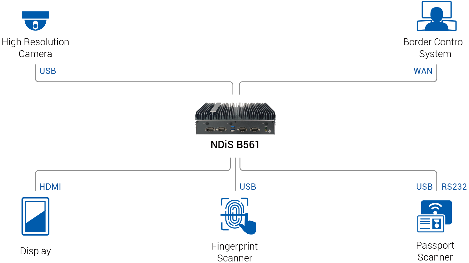 在海關執行時,新漢的 NDiS B561 無風扇視覺邊緣電腦為旅客提供直覺、便捷的邊境通關流程。根據設定,操作員最多可使用三個 HDMI 接口連接三個 4k2k 獨立顯示器,以及八個 USB 3.2 埠連接攝影機、指紋掃描器、護照掃描器和其他外圍設備。由於這台無風扇視覺邊緣電腦透過 WAN 連接到邊境管制系統,因此它可利用 LAN、Wi-Fi 6E、4G、5G 和 AI 人臉辨識技術來驗證旅客的身份